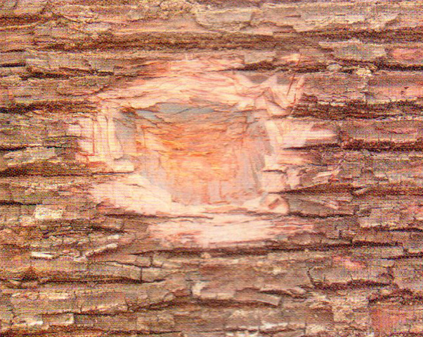 厚1.0~1.5cm,質(zhì)硬,較脆,不易剝離。外皮紅褐色至黑褐色;表面粗糙,具有規(guī)則的深縱裂,易呈窄條片狀剝落。內(nèi)皮紫紅色至淺黃褐色;韌皮纖維發(fā)達(dá)、易成麻絲狀。